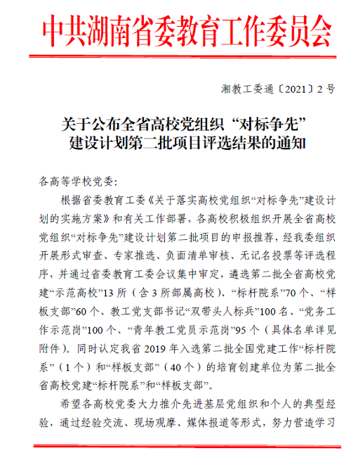 近日,中共湖南省委教育工作委员会印发了《关于公布全省高校党组织“对标争先”建设计划第二批项目评选结果的通知》(湘教工委通〔2021〕2 号),开元党委被评为全省高校党建“示范高校”、马克思主义学院党总支被评为全省高校党建“标杆院系”、文学与新闻传播学院教工第三党支部被评为全省高校党建“样板支部”、数学与计算科学学院信科与高数教研室党支部书记杨旭光、商学院国际经济与贸易教研室党支部书记郑准被评为全省高校教工党支部书记“双带头人标兵”、外国语学院学生第一党支部书记、学工办主任陈阳被评为全省高校“党务工作示范岗”、教育科学学院党总支教师党员江华军被评为全省高校“青年教工党员示范岗”。