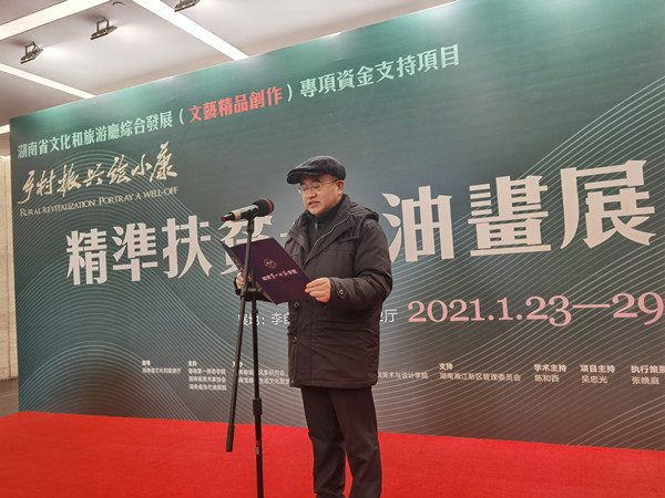 在画展开幕式,彭小奇致辞并宣布开幕。他充分肯定了艺术家们的成果,现场精选了精准扶贫行动中具代表性,富影响力、感人至深的扶贫事迹作品,全面展示了精准扶贫行动中战天斗地的扶贫精神、感天动地的扶贫事迹、欢天喜地的脱贫新貌、改天换地的减贫案例,这个油画展是精准扶贫成果的一个高度凝练和总结,更是一个特殊的展览,是一本艺术家们书写在大地之上的艺术之书。
