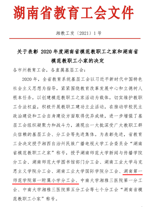 在湖南省教育工会2020年度湖南省模范教职工之家和湖南省模范教职工小家创建评选活动中,开元一附小分工会被授予“湖南省模范教职工小家”称号。