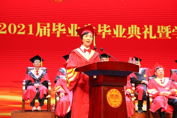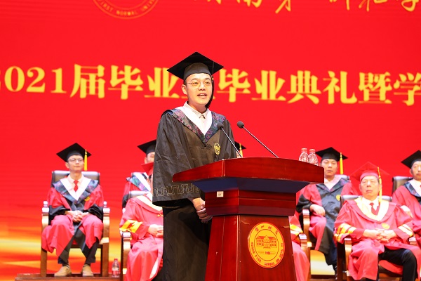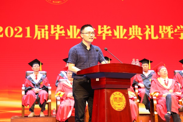 教育科学学院李金国教授作为教师代表发言,向毕业生表达祝贺,勉励全体毕业生终身学习,独立思考,不断开阔眼界,继续秉持“实事求是,不自以为是”校风,迎接崭新未来。文学与新闻传播学院的刘桂山同学代表毕业生发言,号召全体毕业生谨遵母校的教诲,虔诚学习,认真生活,让母校以大家为荣。