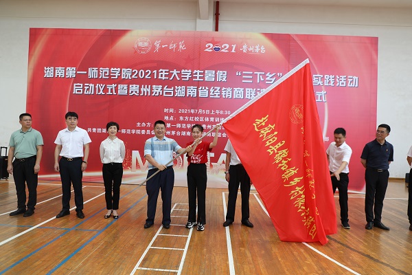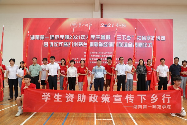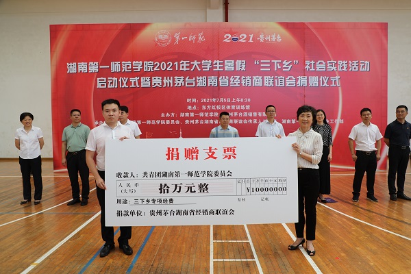 7月5号上午,开元2021年大学生暑期“三下乡”社会实践活动启动仪式暨贵州茅台湖南省经销商联谊会捐赠仪式在东方红校区体育训练馆内隆重举行。校领导罗成翼、童小娇、蒋蓉、赵小群以及贵州茅台酒销售有限公司、贵州茅台湖南省经销商联谊会相关领导出席了仪式。