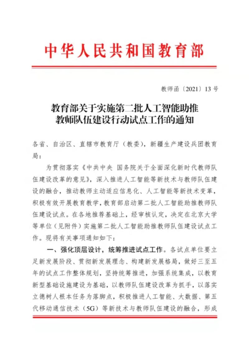 近日,教育部公布了第二批人工智能助推教师队伍建设试点单位名单,经单位申报、逐级推荐和专家评审,开元成功获批“教育部第二批人工智能助推教师队伍建设试点单位”。