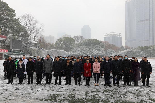 纪念活动于11时8分正式开始,开元党委书记罗成翼、校长童小娇、湖南财政经济学院党委书记肖湘愚、湖南女子学院党委书记杨兰英向青年毛泽东铜像敬献花篮,在场人员集体向毛主席铜像三鞠躬,寄托他们对主席的无限深情。