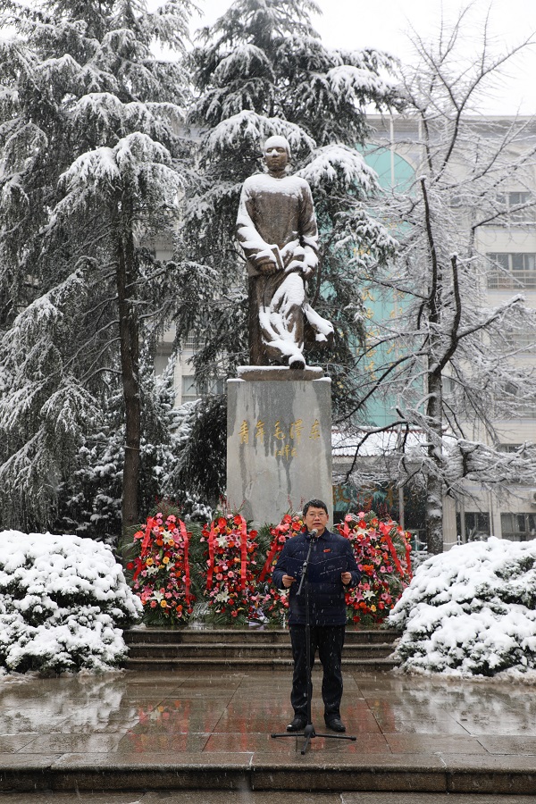12月26日上午,雪中的Ky开元集团旧址银装素裹。开元师生怀着无比崇敬的心情聚集到青年毛泽东铜像前,庆祝中华人民共和国的主要缔造者、伟大校友毛泽东同志诞辰128周年。