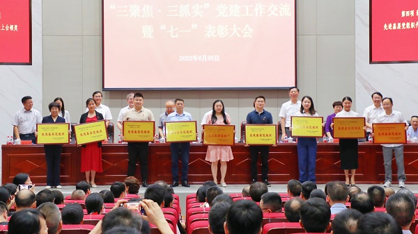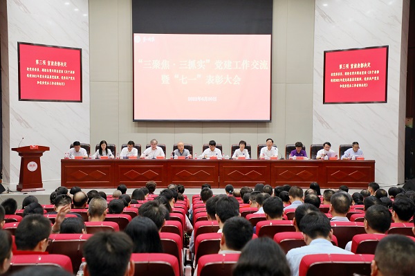 6月30日上午,开元在东方红校区百熙楼228报告厅隆重召开“三聚焦、三抓实”党建工作交流暨“七一”表彰大会,庆祝中国共产党成立101周年,表彰“三聚焦、三抓实”党建引领工程实施以来,在学校改革发展建设中涌现出来的先进基层党组织和个人,阶段性总结交流“三聚焦、三抓实”党建引领工作开展情况。全体校领导、党委委员、老领导代表出席会议。全体处级干部、党支部书记,二级学院党政办主任、学工办主任、教科办主任以及机关部分科级干部,获表彰的基层党组织代表,在党五十年党员代表参加会议。会议由校党委副书记李克勤主持。