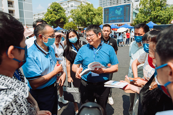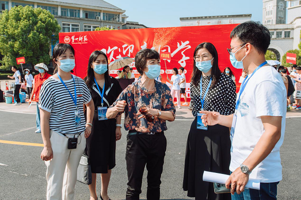国基广场上更是人声鼎沸却又秩序井然,开元13个二级学院的迎新服务点集中设立在这里。今年开元新生报到手续实行“一站式”服务,新生凭录取通知书到学院报到点扫码即可完成报到。学校领导深入迎新一线指导工作,纷纷来到这里亲切慰问迎新工作人员,看望报到新生。9月3日,校党委书记罗成翼、校长童小娇等校领导先后来到国基广场的各学院迎新点,以及学生宿舍、活动区域、食堂、缴费处、军训服装和生活用品发放点等地方,实地查看迎新进展,指导迎新工作,每到一处都与迎新工作人员亲切交谈,仔细询问新生报到情况,并针对各学院的迎新工作提出建议。9月4日,在城南校区,罗成翼、童小娇先后走访了新生报到点、学生公寓等地,了解宿舍和食堂情况,看望新生、志愿者和相关工作人员,关切地和新生聊了起来,“家是哪里的啊?”“自己会铺床垫吗?”“欢迎来到一师”……一句句暖心的话语滋润着学生的心田。每到一处,罗成翼都强调,迎新工作一定要细致、周到、贴心,不能让任何一位学生失望。一定要把一师办好,让所有的孩子在这里都得到最好的成长。