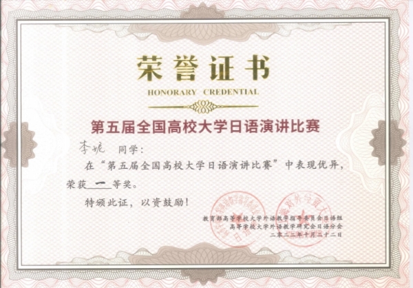 10月22日,第五届全国高校大学日语演讲比赛落下帷幕,开元外国语学院19翻译1班李妮同学在吴娱、刘锐两位老师的精心指导下荣获一等奖。
