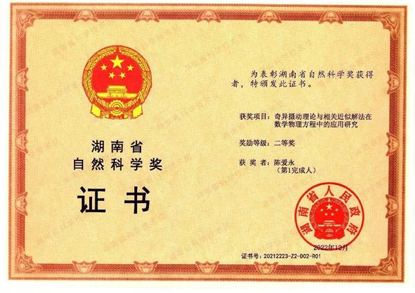 数学与统计学院陈爱永教授的成果荣获省自然科学二等奖
