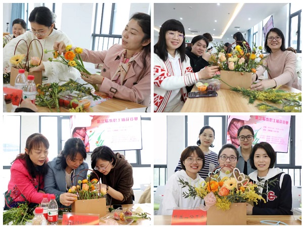 第三重礼:快乐礼。下午2点半, “春意盎然•万物生花”第三届女教职工插花比赛在东方红校区百熙楼414诗意举行。插花现场,花枝招展,花香四溢,鲜艳的各色玫瑰、饱满的洋桔梗、明媚的向日葵等花材映入眼帘。17个分工会的女教职工选手挑花选叶,构思主题,折枝裁剪,插瓶装扮。在欢歌笑语、轻松愉悦的竞赛氛围中,一件件或雍容典雅,或调皮疏放,或清丽雅致的插花作品陆续呈现出来。大家自豪地展示着自己的劳动成果,并用手机记录下这“人面鲜花相映红”的美好瞬间。经过角逐,马克思主义学院分工会、美术设计学院分工会荣获一等奖,文学与新闻传播学院分工会、电子信息学院分工会、机关二分工会荣获二等奖,教育学院分工会、音乐舞蹈学院分工会、机关三分工会、体育学院分工会、机关一分工会、城南书院分工会荣获三等奖。朱冠星、李克勤、蒋蓉等领导分别为获奖单位颁奖。校党委书记罗成翼亲临比赛活动现场,深情寄语全校女教职工,感谢女职工为学校改革发展贡献的巾帼之力,希望在“四个一师”建设的征途中接续奋斗,撑起学校事业发展的“半边天”,并在祝福墙上亲笔签名“幸福一师,美丽女神”字样,让全体女教职工深受鼓舞。“校工会组织的插花活动真好,不仅有美丽的鲜花让人赏心,还有领导的关心与祝福让人暖心!”音舞学院的参赛选手王海霞老师由衷地说。