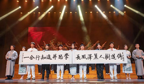 在晚会第二篇“叙·同学少年”中,朗诵《聆听百年颂歌》结合朗诵艺术和书法艺术,诉说着一师共产党人的百年荣光史,表演者挥墨写下“传道树人,丽泽风长”的教风以及“学思并进,知行合一”的学风,表达了新时代一师人初心不改、斗志昂扬、开拓进取、勇毅前行的拳拳之心。