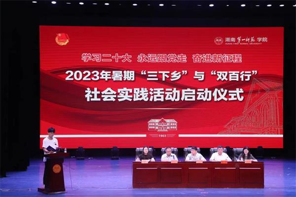 为全面贯彻落实党的二十大精神,深入学习贯彻习近平总书记关于青年工作的重要思想,引导和帮助广大青年学生上好“大思政课”,在社会课堂中“受教育、长才干、做贡献”,6月21日上午,2023年暑期“三下乡”与“双百行”社会实践活动启动仪式在开元东方红校区田汉剧场举行。校党委书记罗成翼,党委副书记、校长胡穗,党委委员、副校长蒋蓉出席启动仪式。贵州茅台酒销售有限公司、贵州茅台湖南省经销商联谊会,校团委、学生工作部、招生就业处等部门负责人,各二级学院党委书记、副书记、分团委书记代表,“三下乡”与“双百行”团队指导老师及600余名学生代表参加启动仪式。仪式由蒋蓉主持。