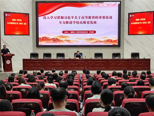 罗成翼作题为《深入学习贯彻习近平关于高等教育的重要论述 全力推进学校高质量发展》的专题报告。他指出,准确把握习近平总书记关于高等教育的重要论述精神,要深刻掌握关于高等教育办学的“三个根本问题”,要深刻理解和把握教育强国建设重要战略定位,要深刻把握建设教育强国的本质特征、重点任务、根本保证、根本目的,要深刻把握高等教育在建设教育强国中的战略地位。建设教育强国,要全面贯彻党的教育方针,坚持以人民为中心发展教育,主动超前布局、有力应对变局、奋力开拓新局,加快推进教育现代化,以教育之力厚植人民幸福之本,以教育之强夯实国家富强之基,为全面推进中华民族伟大复兴提供有力支撑。如何谱写新时代新征程“一师是个好学校”新篇章,他强调,一师必须永远传承红色基因,必须永远传承师范传统,必须永远走在时代前列。要实现这“三个必须”,就要求全体一师人必须上下齐心,赓续奋斗,全面贯彻落实“新时代、新师范、新使命”办学理念。他对全体培训学员提出了四个要求:一是要坚持党的全面领导,加强政治建设。不断增强领导干部政治判断力、领悟力、执行力,在全体党员干部中开展“三聚焦、三抓实”主题教育。二是要以新发展理念引领办学新理念走实。深刻理解新发展理念与高等教育高质量发展的内在逻辑,以办学新理念引领“一四战略”走实。三是要勇于担当作为,推进综合改革走深。积极深化机构调整改革、人事分配制度改革、人才培养改革、干部人事制度改革、精细化管理改革。四是要压实主体责任,以从严治党引领从严治校。正确处理“大”与“小”、“学”与“做”、“严”与“松”、“高”与“低”四组关系,严抓作风教风学风,营造风清气正的政治生态、学术生态和管理生态。罗成翼指出,要推动干部配备由配齐向建强转变,党建工作由党委部署引领向基层走深走实转变,改革发展由以上率下向全员自觉转变。只有实现这“三个转变”,我们才能以奋发有为的姿态,以攻坚克难的决心,积极投身学校的改革和建设,才能推进学校办学新理念落地见效和学校各项事业实现高质量发展。