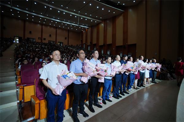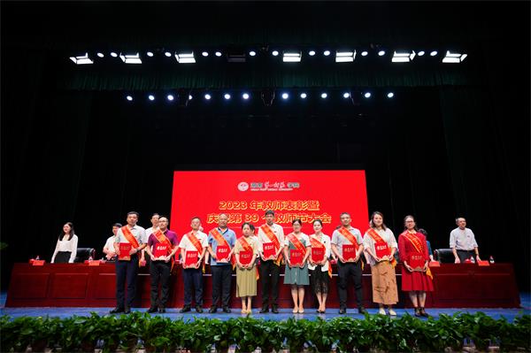 伴随着雄壮的国歌声,大会庄严开幕。学生代表向省级优秀教师、优秀教育工作者代表、优秀团队代表及入选“润之人才计划”领军人才代表献花致敬。