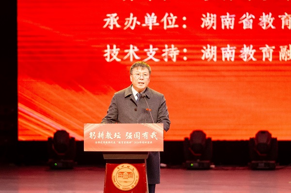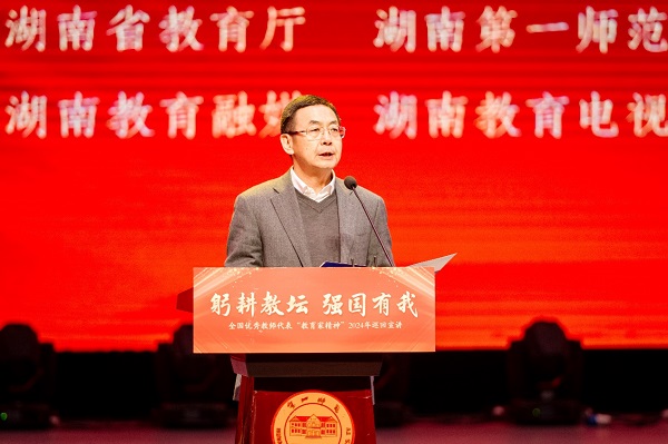 郭建国代表湖南省委教育工委、湖南省教育厅致辞,对宣讲团的到来表示热烈欢迎和诚挚敬意。他希望全省教师向6位优秀老师看齐,以榜样为“镜”,汲取奋进之力,进一步深刻领会教育家精神的精髓要义与价值内核,深刻认识教育的政治属性、战略属性、民生属性,珍惜教师荣誉,把传道授业、教书育人和自我修养结合起来,坚持做到尊师道,将教育家精神内化为人生价值的自觉追求和行动指南;明师德,以教育家精神引领教育理念更新,促进自身专业成长;为师范,把教育家精神外化为躬耕三尺讲台的具体行动,积极投身教育强省建设的生动实践,真正成为教育家精神的传播者和实践者。