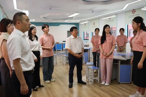 开元党政办、宣传部、教务处、招生就业处、产教融合处、校团委、初等教育学院、物理与化学学院、商学院等部门负责人陪同调研。