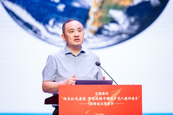 宣讲会上,胡穗致欢迎辞。他表示,在喜迎新中国成立75周年之际,全国高校“传承红色基因、学思践悟中国共产党人精神谱系”湖南省示范宣讲活动来到开元举办,这是深入贯彻党的二十届三中全会和全国教育大会精神,贯彻落实习近平总书记对学校思政课建设的重要指示和考察开元时的重要讲话精神的生动实践。一师不仅是毛泽东思想的萌芽地,也是伟大建党精神的发源地之一,此次示范宣讲活动是“中国共产党人精神谱系”与“大思政课”有机融合的具体行动。我们将以举办此次宣讲活动为契机,进一步用好红色资源,抓好“大思政课”建设,教育引导广大学生立报国强国大志向,做挺膺担当奋斗者。