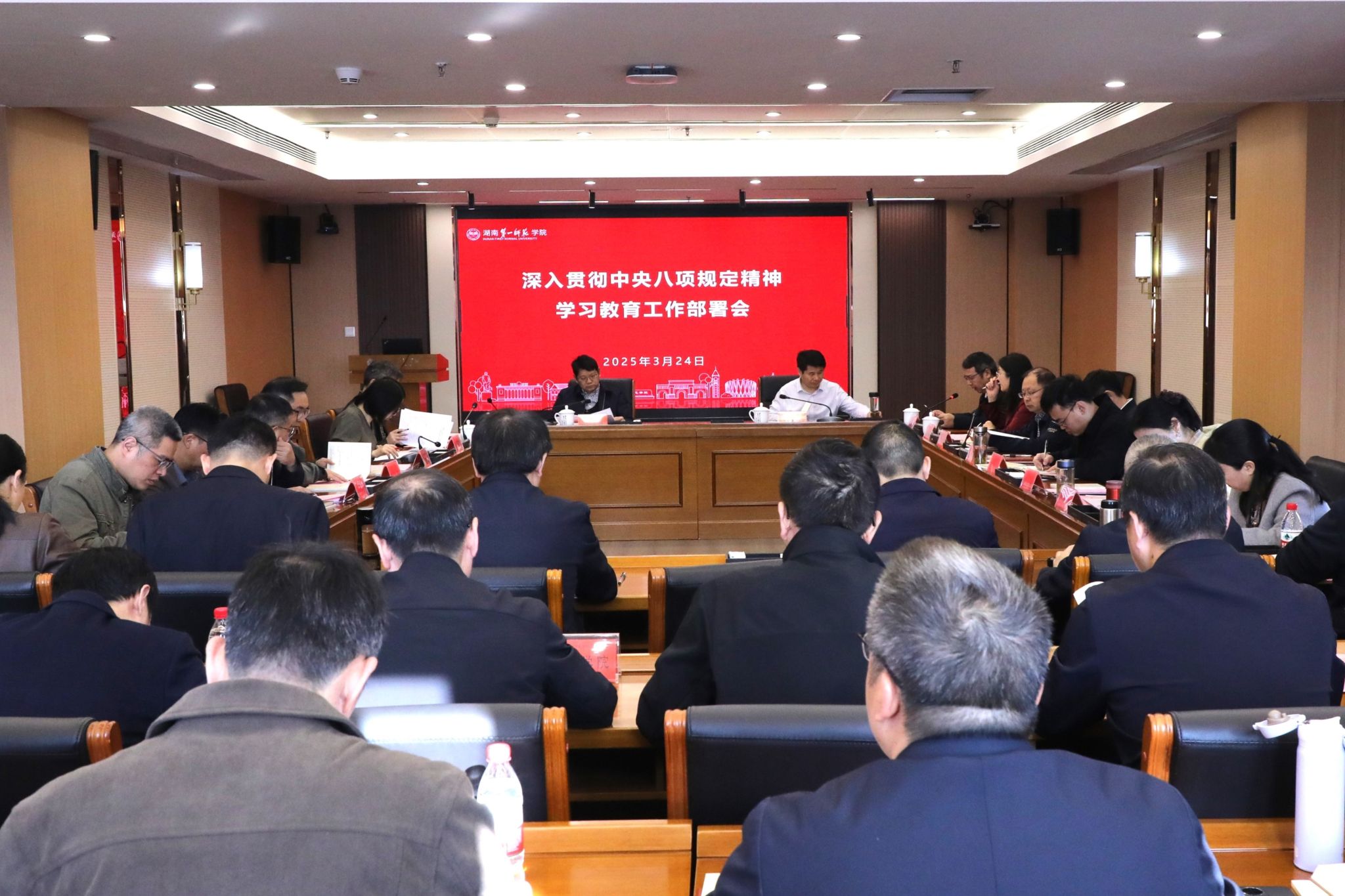会议强调,一要心中有戒,深刻认识中央八项规定及其实施细则精神的背景由来。系统认识党在不同时期加强作风建设的探索,深刻领会新时代加强党的作风建设的历史逻辑、理论逻辑和实践逻辑,把中央八项规定作为铁规矩、硬杠杠,进一步增强在新征程上持续推进党的作风建设的自觉性和坚定性,为以中国式现代化全面推进强国建设、民族复兴伟业提供坚强作风保证。二要行有所止,牢牢把握中央八项规定及其实施细则精神的内容要求。准确把握学习教育的核心要义,精学习近平总书记关于加强党的作风建设的重要论述和中央八项规定及其实施细则精神。要抓好“关键少数”,强化分类指导,以上率下推动学习教育走深走实。三要严于律已,认真抓好中央八项规定及其实施细则精神的学习贯彻。联系思想与工作实际,对标对表全面深入查摆问题,并抓实集中整治,立查立改、即知即改;坚持开门教育,注重群众参与、接受群众监督,走好新时代党的群众路线;简约务实,聚焦主题、注重实效,力戒形式主义,扎实做好规定动作。四要防控风险,坚守纪律底线,牢筑廉政防线。把开展学习教育同贯彻落实学校党委战略部署和全年重点工作安排有机结合起来,切实把作风建设贯穿到管党治党、办学治校、立德树人全过程各方面,聚焦基建后勤、招生、职称评定、项目评审、采购招投标、选人用人、科研经费管理等关键领域和重点环节,统筹业务监管和纪律监督,坚持一体推进“三不腐”,将廉政风险防控贯穿学校发展全过程,不断为学校高质量发展提供坚强保障。