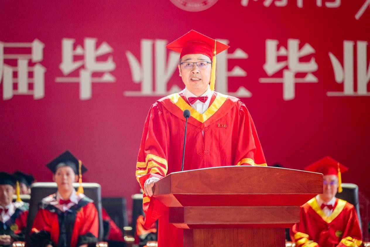 在热烈的掌声中,罗成翼代表学校致毕业贺辞,向即将奔赴祖国各地建功立业的2025届毕业生表示热烈的祝贺和美好的祝愿,向为他们成长成材付出辛劳的各位老师和家长,致以衷心的感谢和崇高的敬意。2025届毕业生是学校“一四”战略全面实施的首届毕业生,是承载着特殊使命的一届学生。罗成翼深情回忆了毕业生在校期间践行办学新理念、共同见证和创造学校跨越式发展的一个又一个高光时刻,重温了习近平总书记亲临学校视察时的殷切嘱托,以及百廿校庆的荣耀,学校办学层次实现历史性突破的自豪,考研录取率从6.39%跃升至22.24%、招生规模扩大但录取分数线却稳居高位的欣慰,还有一师红墙、新体育馆、新工科楼、新宿舍楼等文脉味与现代风交融的校园新地标拔地而起、学习生活环境不断优化的幸福。