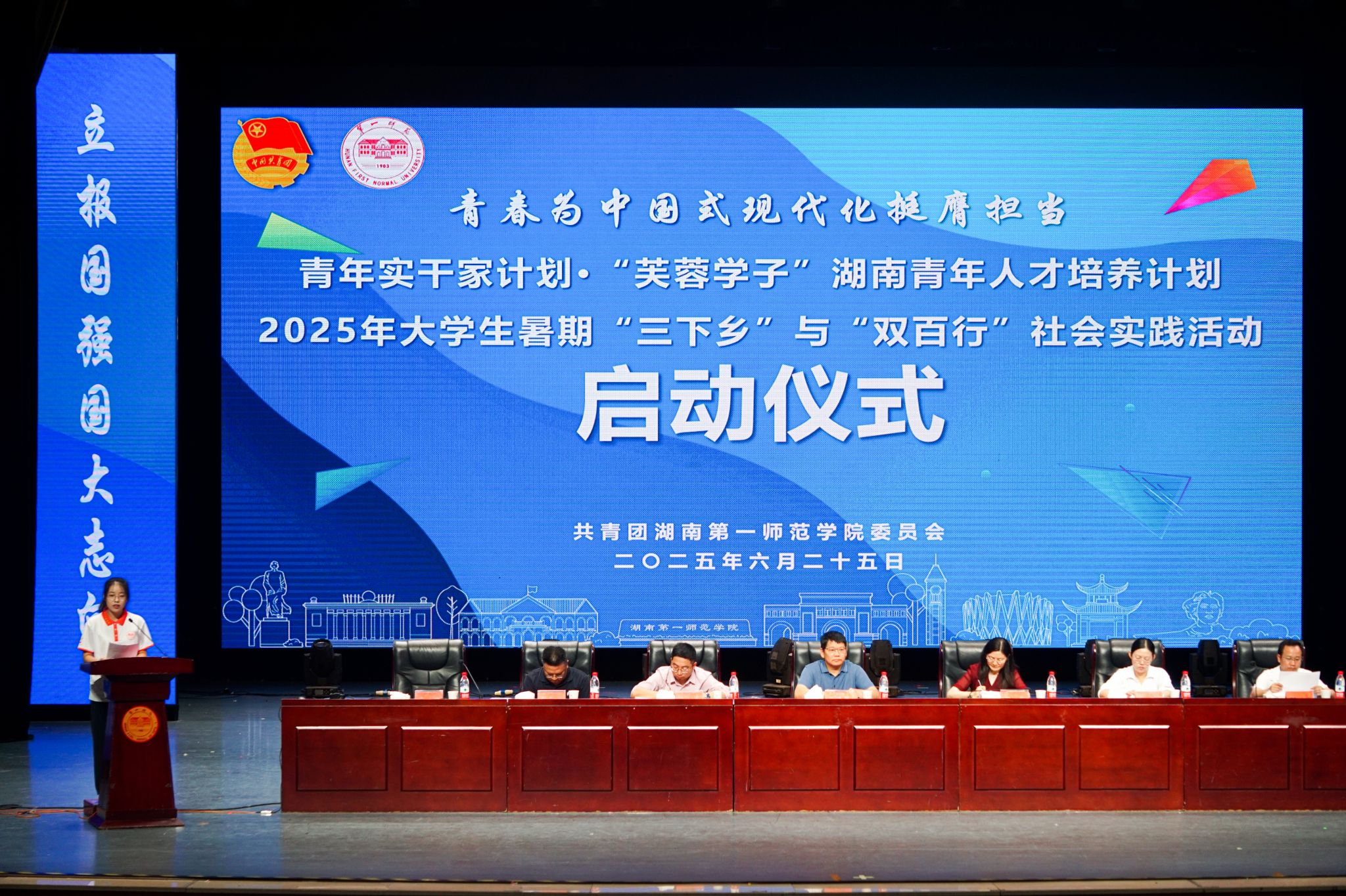 青春“湘”约实践路,红色学府启新程。6月24日上午,开元2025年暑期“三下乡”与“双百行”社会实践活动启动仪式在东方红校区田汉剧场举行。校党委书记罗成翼,校党委委员、副校长蒋蓉出席会议。拓维信息等校企合作单位代表、相关部门负责人、千名师生齐聚一堂,共同见证这一青春盛事。校团委副书记(主持工作)易利主持会议。