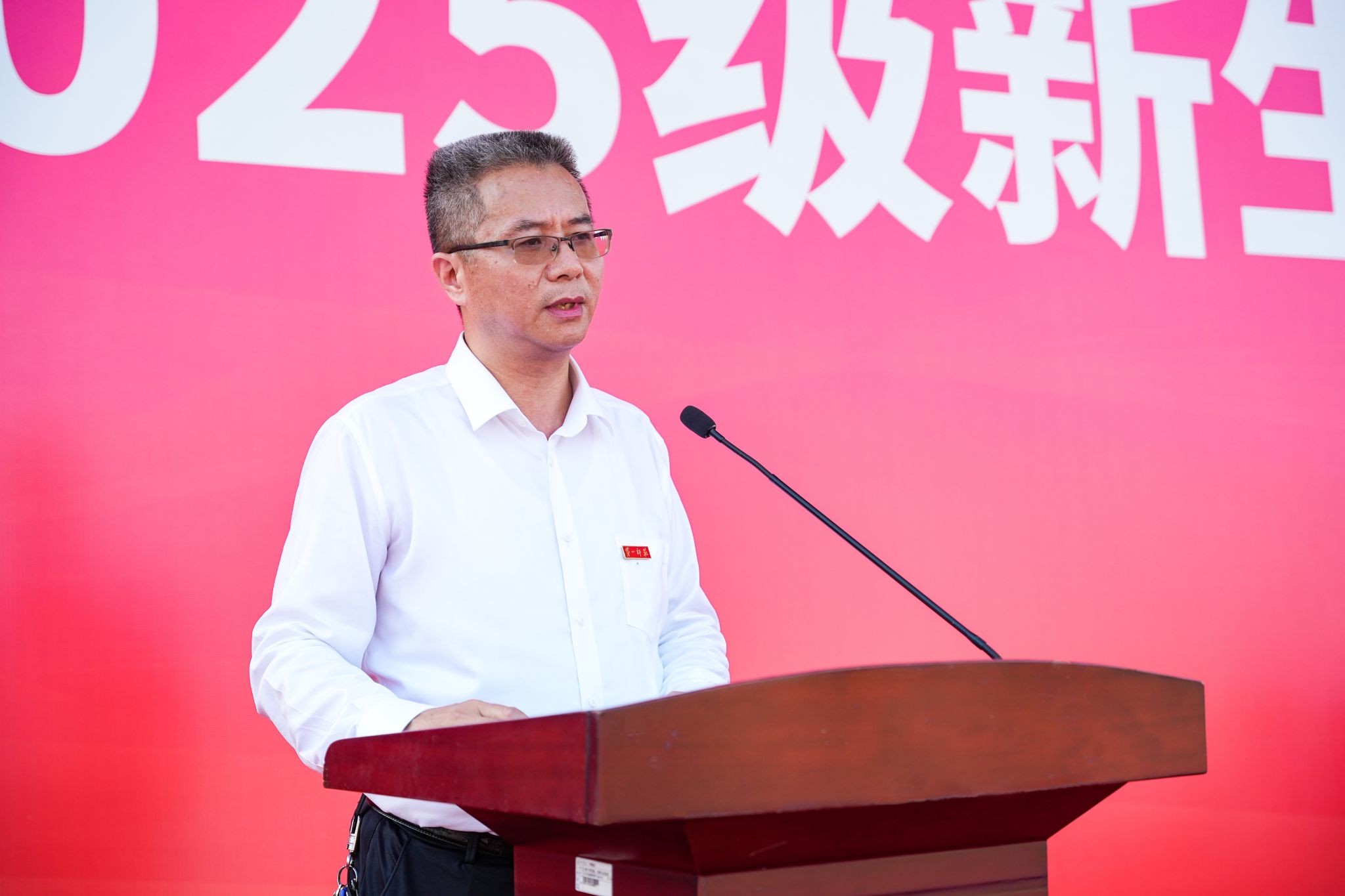 大会在庄严的国歌声中拉开序幕。全场师生面向国旗肃立,目光紧紧追随着冉冉升起的五星红旗。罗成翼宣布2025级新生开学典礼暨军训总结表彰大会正式开始。
