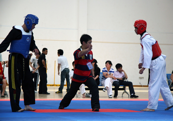 5月2日,我院体育系主任黄依柱、副主任朱建伟、副书记张尚晏、教研室主任周建洪在跆拳道教练刘炜、姜辉军的陪同下,观看、指导了全程比赛,并与各大高校的跆拳道教练和学生进行了亲切的交流。