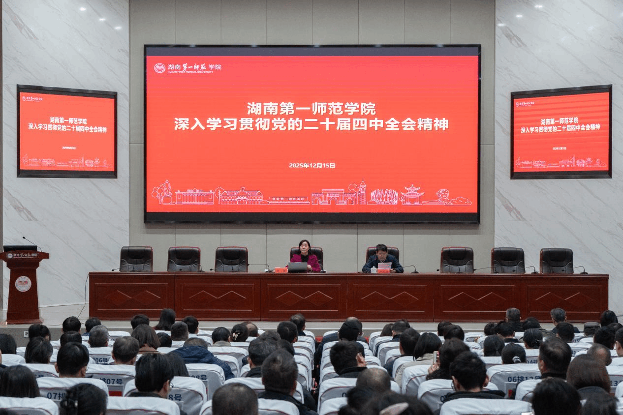 报告会上,刘艺以“奋力开创中国式现代化新局面”为主题,紧紧围绕习近平总书记在党的二十届四中全会上的重要讲话精神和《中共中央关于制定国民经济和社会发展第十五个五年规划的建议》,结合湖南高校尤其是师范院校发展实际,对“十五五”时期的历史方位、总体部署、战略任务以及推进中国式现代化的根本保证进行了系统解读。她通过一系列数据和案例,深入分析了国内外深刻复杂变化的形势,重点剖析了经济社会发展的指导方针和主要目标,并建议高校锚定教育强国目标,服务湖南“三高四新”战略,以教育链对接产业链、人才链支撑创新链,在弘扬和践行社会主义核心价值观、加快高水平科技自立自强等方面彰显高校担当、贡献高校力量。与会同志一致认为宣讲报告视野宏阔、思想深邃,理论脉络清晰、实践导向鲜明,既有理论深度又有实践温度,对全面、准确、深入理解把握党的二十届四中全会精神,找准办学定位、明晰发展路径,在“十五五”时期持续推进特色鲜明的师范大学建设,具有重要的指导意义。