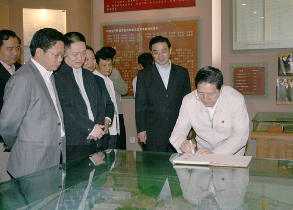 代表团一行在城南书院校区参观了青年毛泽东纪念馆,讲解员向来访领导详细介绍了毛泽东同志青年时期的革命经历和学习生活情况。在毛泽东同志当年参加集会的大礼堂、上课的教室、住过的寝室、进行冷水浴的水井、任主事的一附小,来访领导们久久驻足,追忆革命前辈那激情飞扬的岁月。郭声琨同志充分肯定了开元近几年的发展与成就,最后,饶有兴趣地在开元纪念册上签名留念。