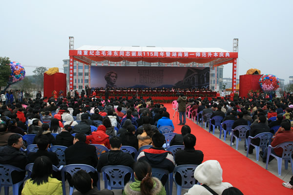 中共湖南省委副书记梅克保代表湖南省委、省人大、省政府、省政协表示祝贺并发表了重要讲话。梅克保同志指出,在毛泽东同志学习和工作长达八年之久的湖南第一师范,隆重纪念他老人家诞辰115周年,缅怀他的丰功伟绩,传承他的精神品质,推动他所关心的母校又好又快发展,既是对他老人家的最好怀念,也是促进湖南教育事业加快发展的积极举措。他强调,湖南第一师范是一所蜚声海内外的名校,有着光荣的革命传统和辉煌的办学业绩。尤其是近八年来,学校实现了办学层次由中专到大专、再到本科的两次跨越,各项工作取得了显著成绩,在科教兴湘、富民强省的伟大征程中发挥着越来越重要的作用。他希望湖南第一师范以升本为契机,继续大力弘扬“千年学府、百年师范”的优良传统,认真总结办学经验,充分借鉴国内外先进做法,进一步解放思想,深化教育改革,推进教育创新,突出办学特色,不断提高教育质量和办学效益,顺利实现规模扩张与内涵建设的协调发展,早日建成以培养高素质小学师资为主的特色鲜明的高等师范院校,为服务祖国建设特别是湖南的经济社会发展作出新的更大的贡献。