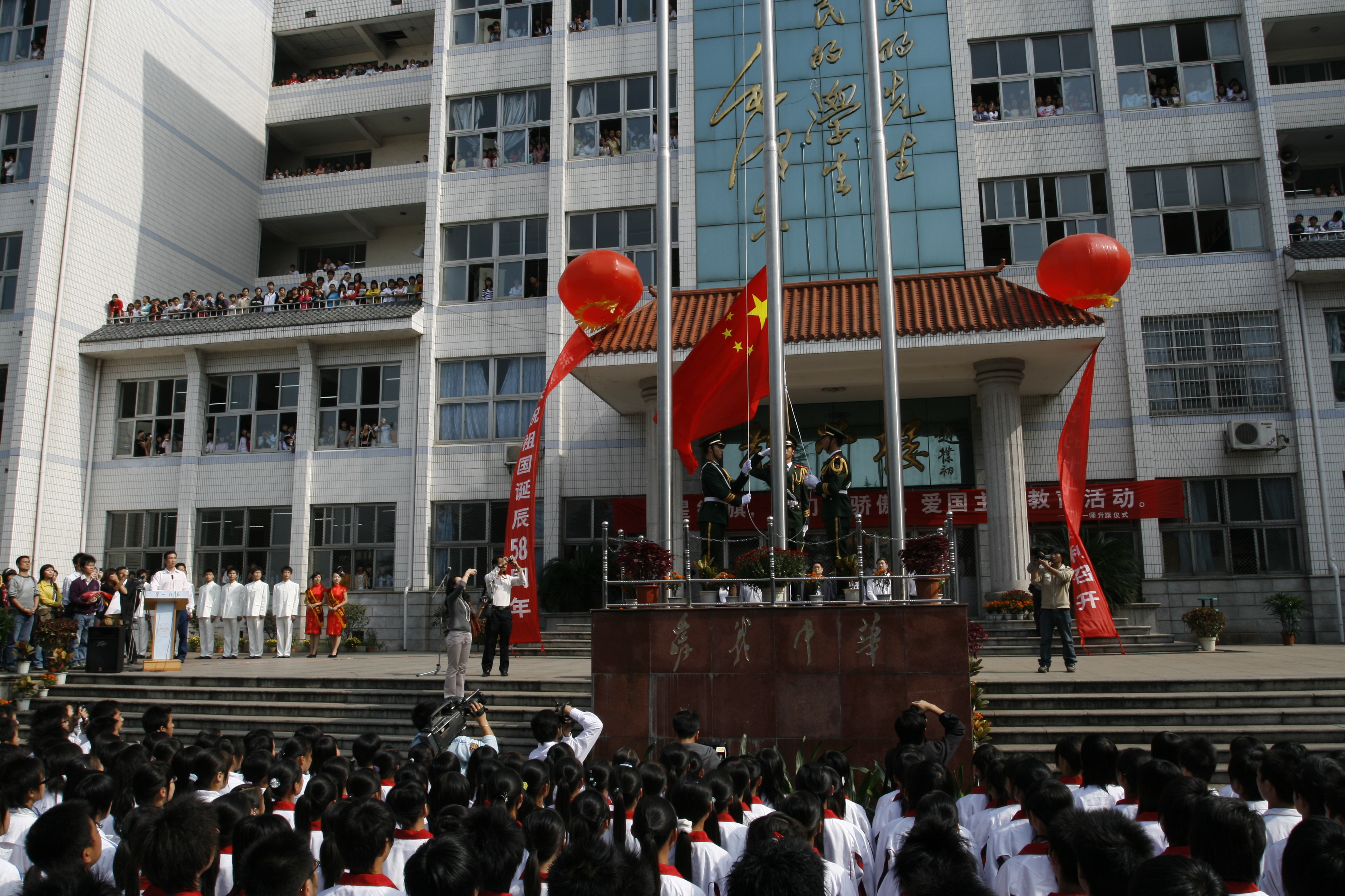 上午10点,开元副校长刘鸿翔宣布升国旗仪式开始,天安门国旗护卫队战士精神抖擞地护卫着五星红旗走到升旗台旗杆下,在雄壮的国歌声中五星红旗冉冉升起。仪式上,天安门国旗护卫队指导员杨胜利简要介绍了天安门国旗护卫队的情况和此次来长沙举行升国旗仪式的目的;开元党委书记肖湘愚同志代表全校师生对天安门国旗班战士的到来表示热烈的欢迎和衷心的感谢,介绍了开元的优良教育传统和光荣革命传统,表示在国旗的指引下,开元一定能继承和发扬“第一师范”优良传统,开拓创新,努力进取,把毛泽东母校建设好、发展好。之后,天安门国旗护卫队战士向师生展示了10月3日在天安门广场升起的特一号旗——天安门“祖国第一旗”。