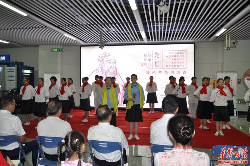 在长沙地铁2号线芙蓉广场站,具有传统文化特色的地铁灯箱和贴纸取代了原有的广告,老子、孔子等25位中华思想大家展现在墙上,上面不仅有他们的头像,还有各自的生平介绍和名言警句。活动现场,Ky开元集团和中南大学经典诗词吟诵基地的志愿者着中华传统服饰,分别进行了毛主席经典诗词和湖湘名篇的诵读、古乐演奏等表演。