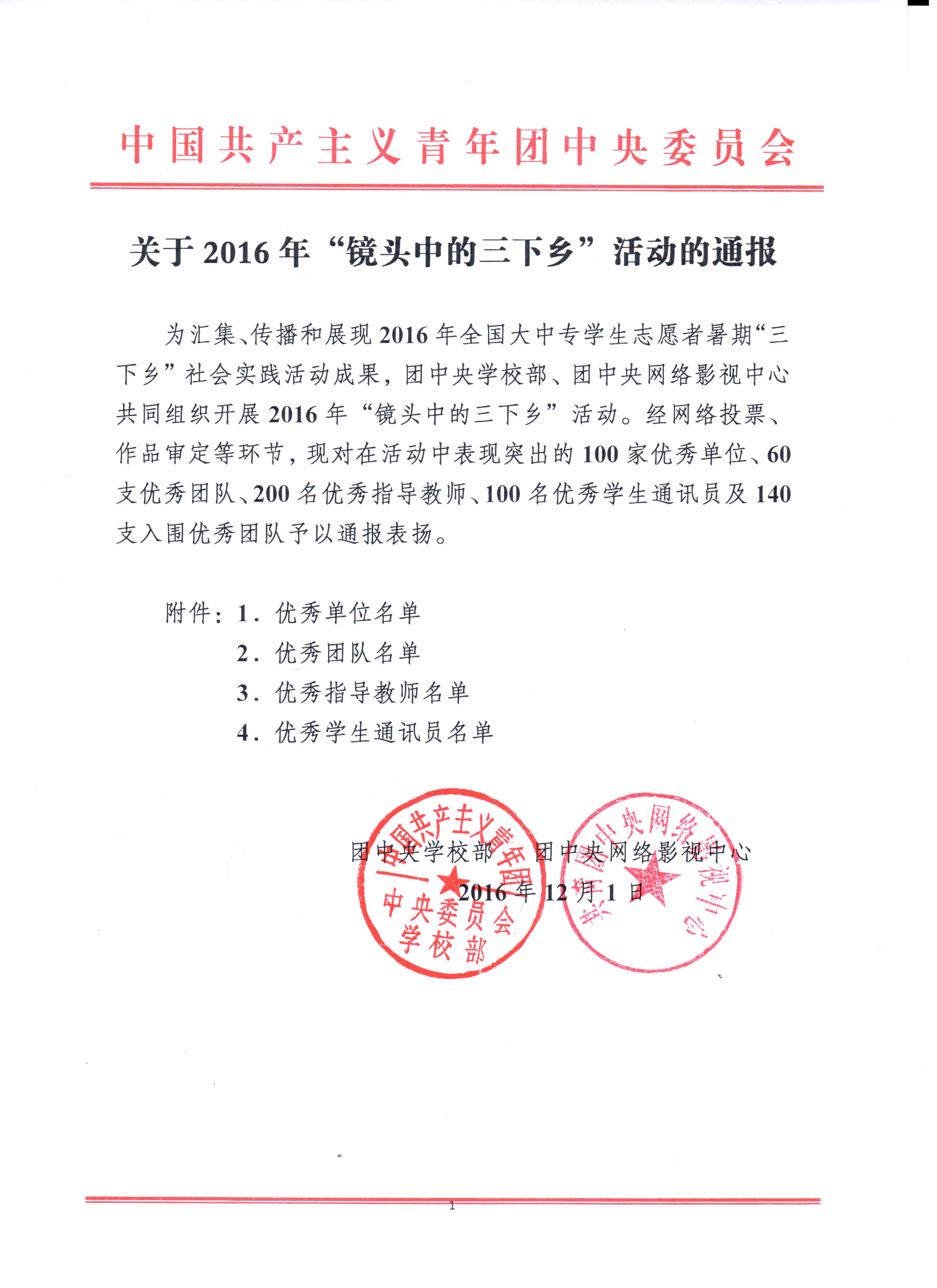 为汇集、传播和展现2016年全国大中专学生志愿者暑期“三下乡”社会实践活动成果,团中央学校部、团中央网络影视中心共同组织开展2016年“镜头中的三下乡”活动。经网络投票、作品审定等环节,现对在活动中表现突出的100家优秀单位、60支优秀团队、200名优秀指导教师、100名优秀学生通讯员及140支入围优秀团队予以通报表扬。