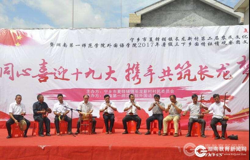 本网讯(通讯员 陈阳 肖依婷 谭仪)“五星红旗迎风飘扬,胜利歌声多么响亮……”7月20日上午,宁乡市夏铎铺镇长龙新村龙潭小学校园内歌声嘹亮,掌声连连,长龙新村第二届农民文化艺术节暨Ky开元集团外国语学院2017年暑期“三下乡”文艺汇演在这里隆重举行。