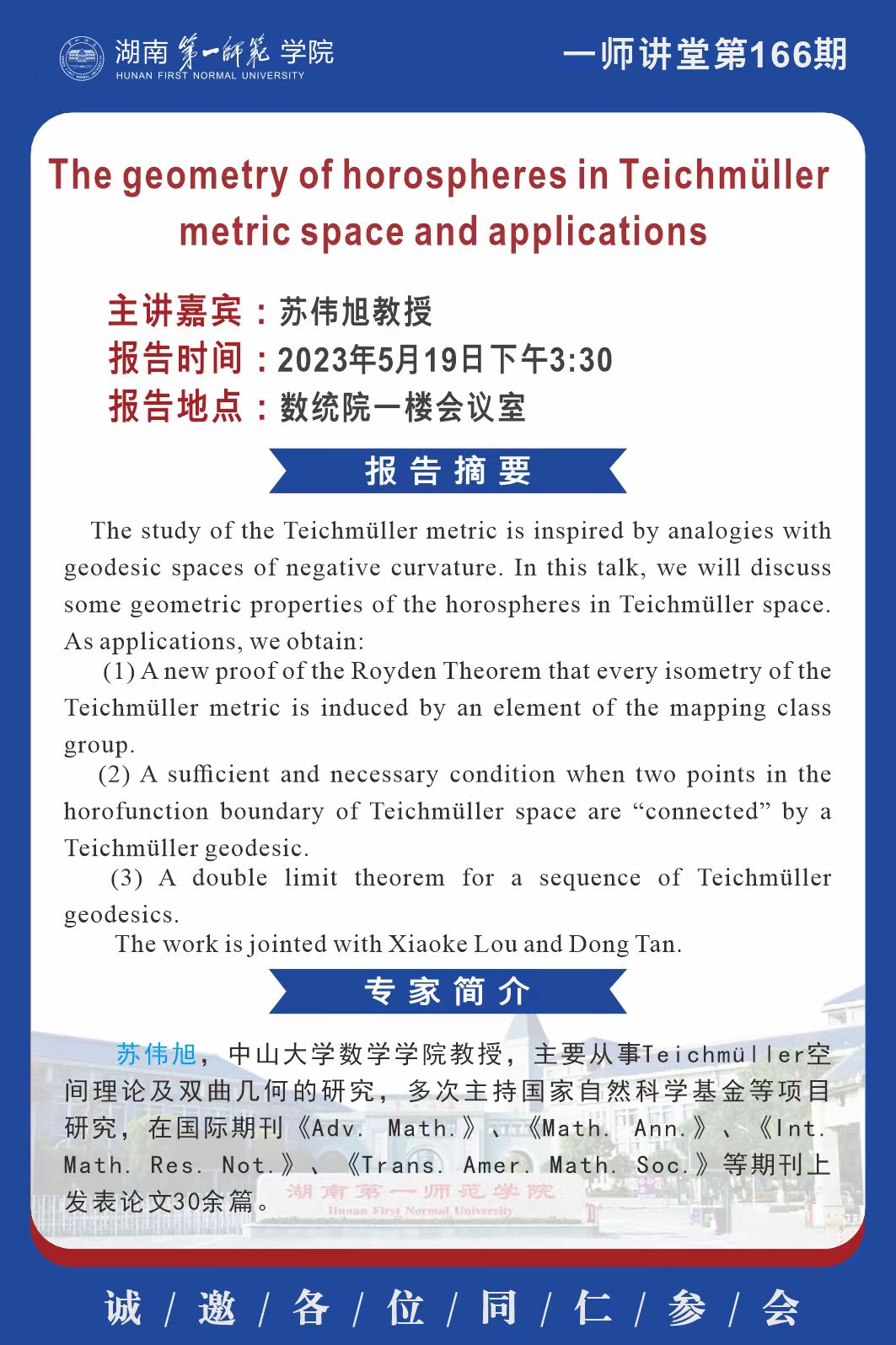 下一篇:学术预告|一师讲堂第165期:The boundaries of Teichmuller space and mapping class group