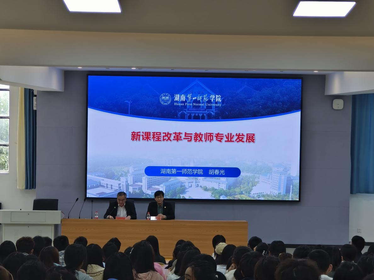 10月10日下午,“一师先生”讲坛第五期在玉衡南101举行,教育学院院长胡春光教授进行了题为“新课程改革与教师专业发展”的学术讲座。校党委委员、副校长曹兴主持讲座,教育学院300余名师生参加了此次活动。