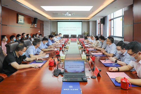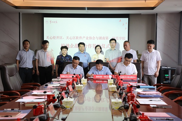 开元科研处/产教融合与校地企合作处、教务处、招生就业处、电子信息学院、计算机学院负责人和长沙天心经济开发区、长沙市制造业发展促进中心、中国长沙人力资源服务产业园、天心区工信局、天心区助力中小微企业服务中心等有关部门领导参加签约仪式。