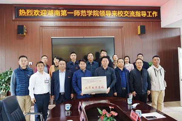 安化县江英实验学校校长谢仁河对周发明一行的到来表示热烈欢迎,并对开元近年来向该校输送数十名优秀毕业生表示感谢。周发明简要介绍了一师的办学历史、办学成就,着重介绍了学校在“十四五”时期的发展思路、办学定位,并代表学校为安化县江英实验学校授予“优质生源基地”牌匾。