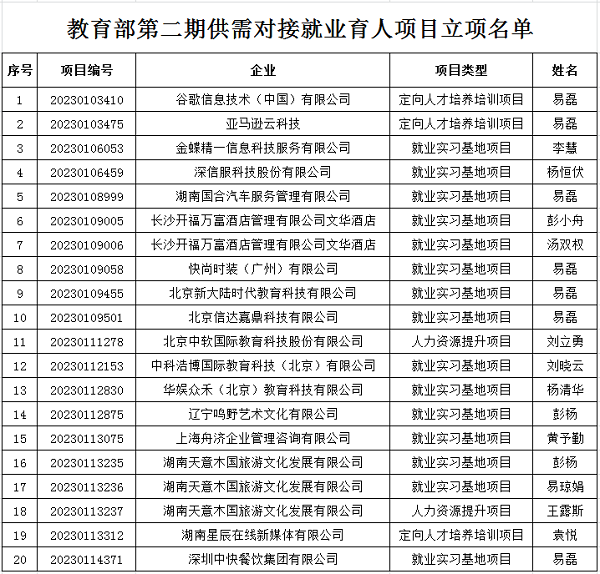近日,教育部学生司公布了第二期供需对接就业育人项目立项名单。开元共有20个项目被批准立项,其中,定向人才培养培训项目3个、就业实习基地项目15个、人力资源提升项目2个。