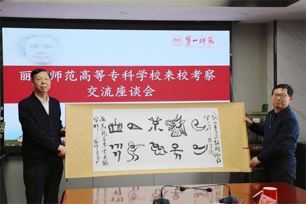 最后,彭鸿昌代表丽江师专向开元赠送了用纳西族东巴文书写的“海为龙世界,云是鹤家乡”书法作品,象征着两校以合作促发展创未来的美好愿景。