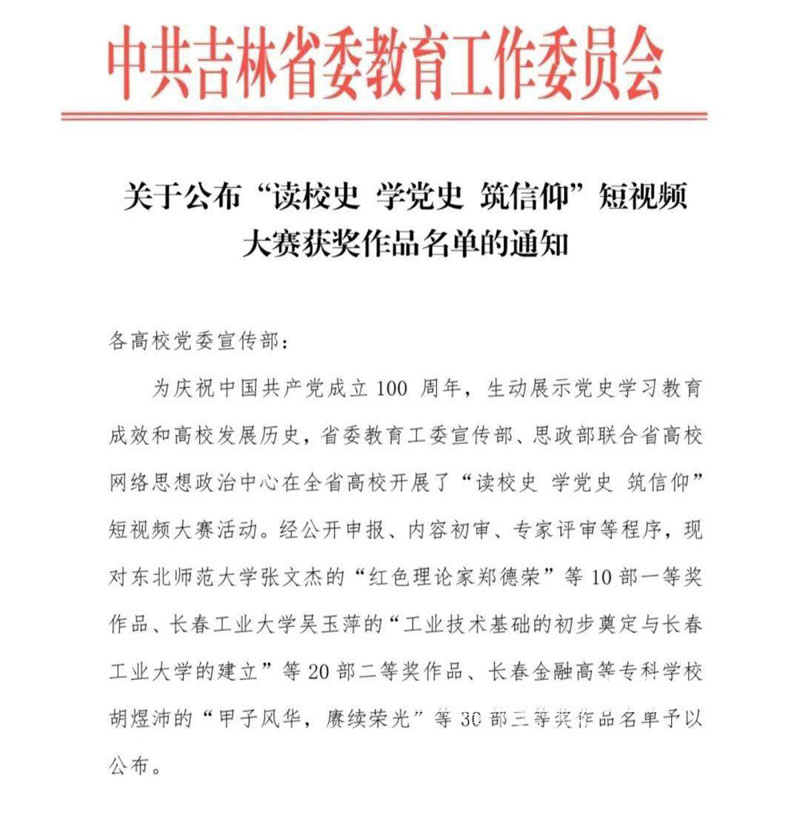 (记者 何鑫)近日,为庆祝中国共产党成立100周年,生动展示党史学习教育成效和高校发展历史,省委教育工委宣传部、思政部联合省高校网络思想政治中心在全省高校开展了“读校史 学党史 筑信仰”短视频大赛活动。经公开申报、内容初审、专家评审等程序,全省高校共有10部作品获得一等奖、20部作品获得二等奖、30部作品获得三等奖。永利官网两部参赛作品《我们的校长朱德海》(作者:王柏松、梅涛)和《金洙哲的草木人生》(作者:王...