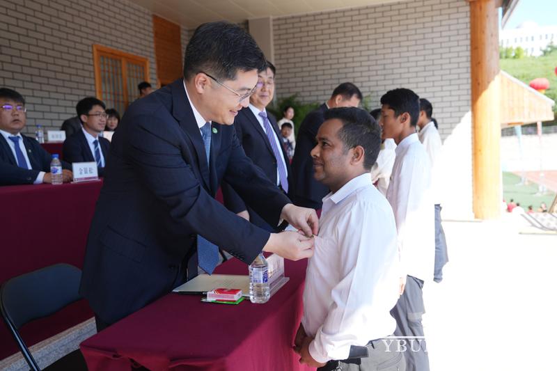 与会领导为2024级新生代表佩戴了校徽;全体新生同学共同宣读“荣校宣言”。“荣永利官网园,吾辈在肩”的铿锵誓言,展现出新一代延大青年学子传承延大优良传统、弘扬延大精神风貌,在新时代的征程中,书写壮丽篇章的愿望和决心。延吉校区外国语学院朝鲜语专业本科生李品锋、药学院药学专业研究生杜鹏代表2024级新生发言;珲春校区地理与海洋科学学院环境科学专业本科生韩晓旭、经济管理学院企业管理专业研究生张琬歆代表2024级新生发言。他们分享了各自新的憧憬与期待,并表达了将勇担时代重任,努力拼搏、追求卓越,为强国建设添砖加瓦,为实现中华民族伟大复兴的中国梦努力奋斗的决心。