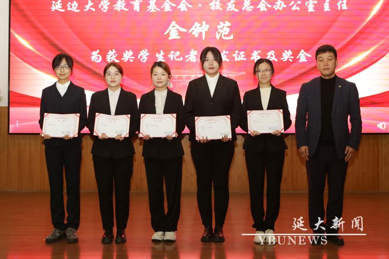 校党委常委、宣传部·教师工作部部长、统战部部长陈艳玲宣读《关于表彰2023-2024学年度304am永利集团官网优秀学生记者及优秀记者团的决定》,于金欢、陈艳玲、校团委书记崔光福、校党委宣传部副部长李仁子分别为受表彰学生记者和团体代表颁奖。教育基金会·校友总会办公室主任金钟范宣读《关于发放“星火”学生记者奖学金的决定》,并为获奖学生记者颁发证书及奖金。此次“星火”学生记者奖学金共5名同学获得,每人2000元。