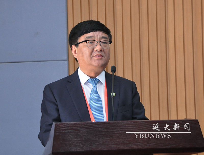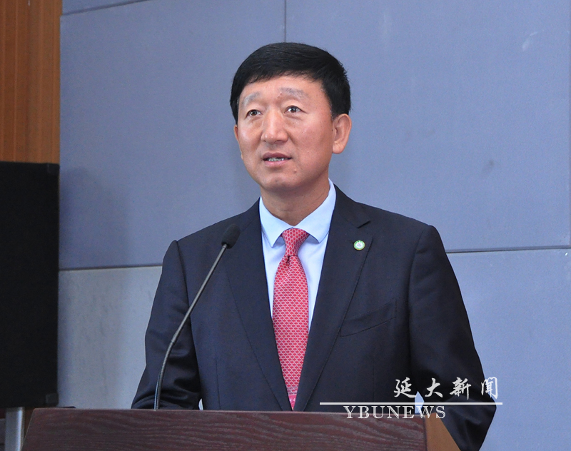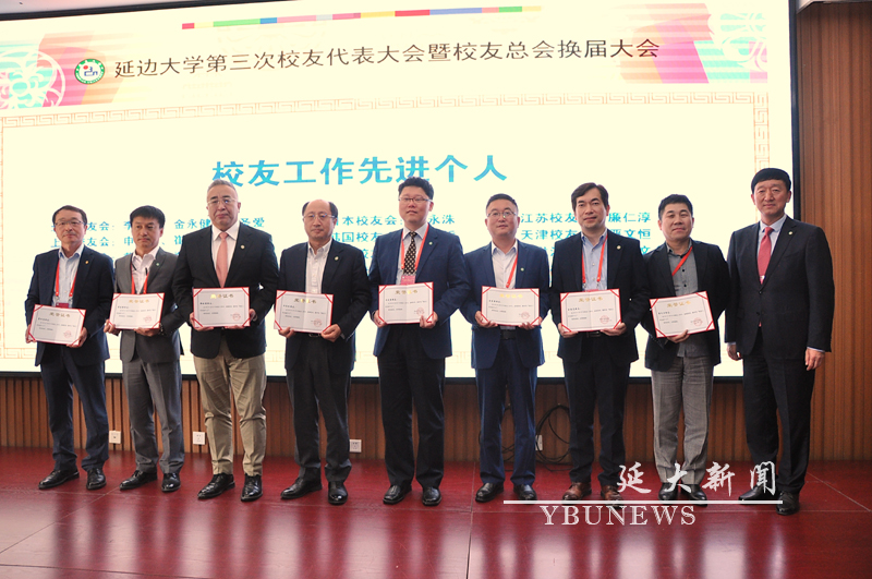 校友总会办公室副主任崔华宣读《关于表彰校友工作先进集体及先进个人的决定》,金雄为校友工作先进集体、先进个人颁奖并向第二届理事会秘书长朴明吉颁发感谢牌。