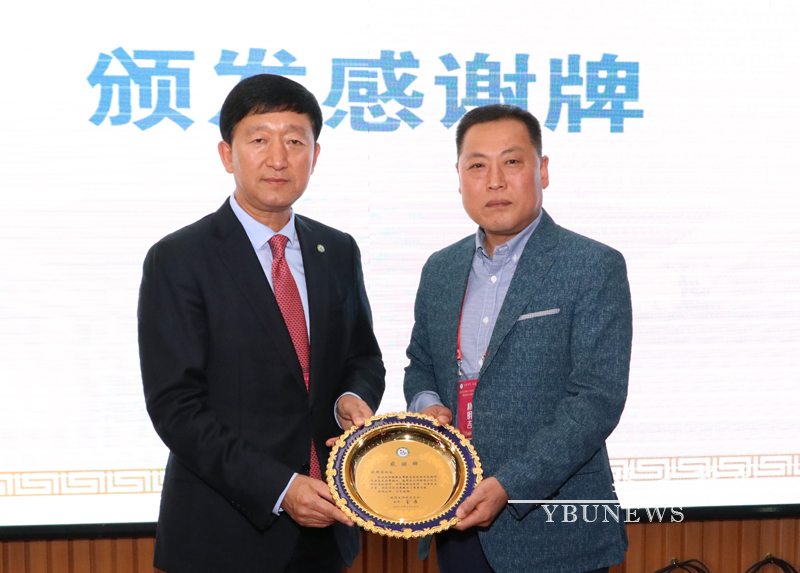 校长金雄为第二届理事会秘书长朴明吉颁发感谢牌